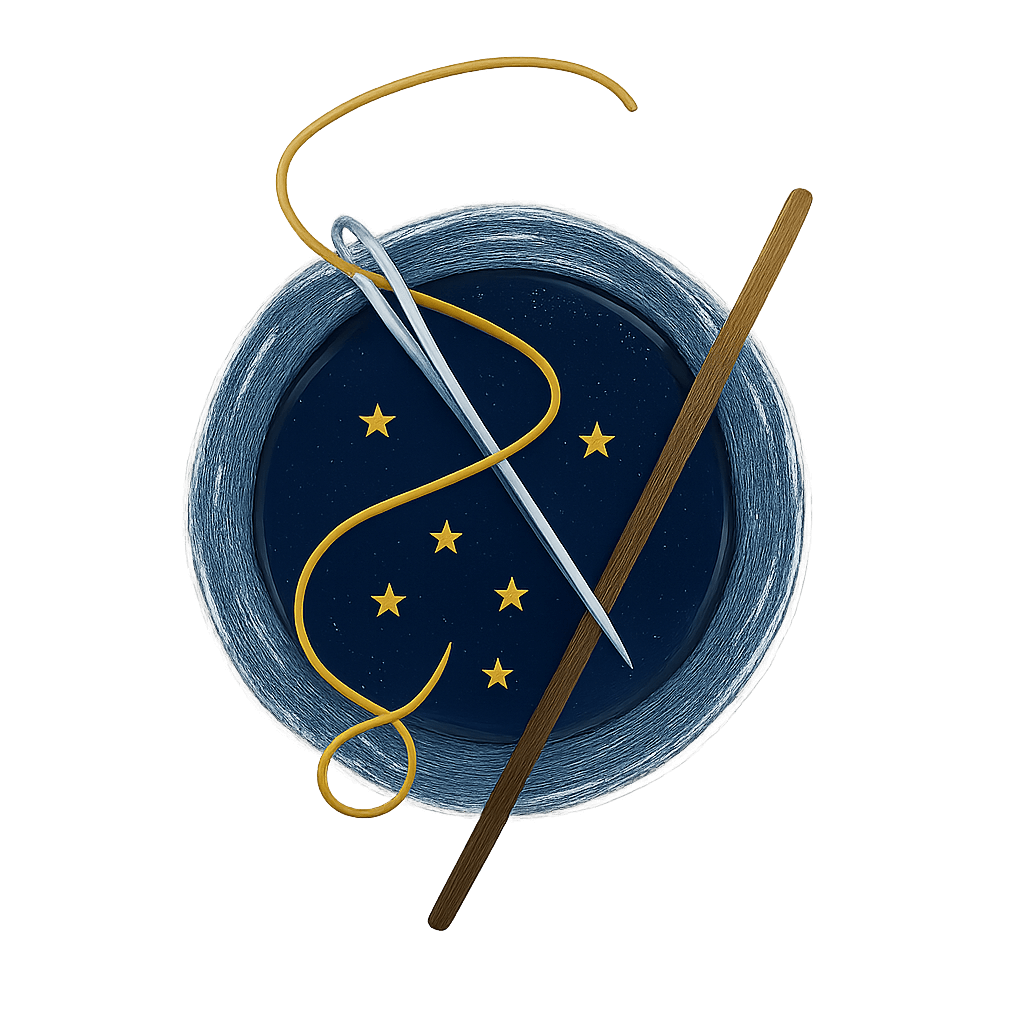 The golden thread and needle in the logo represent that act of weaving: stories stitched from pain and hope alike.